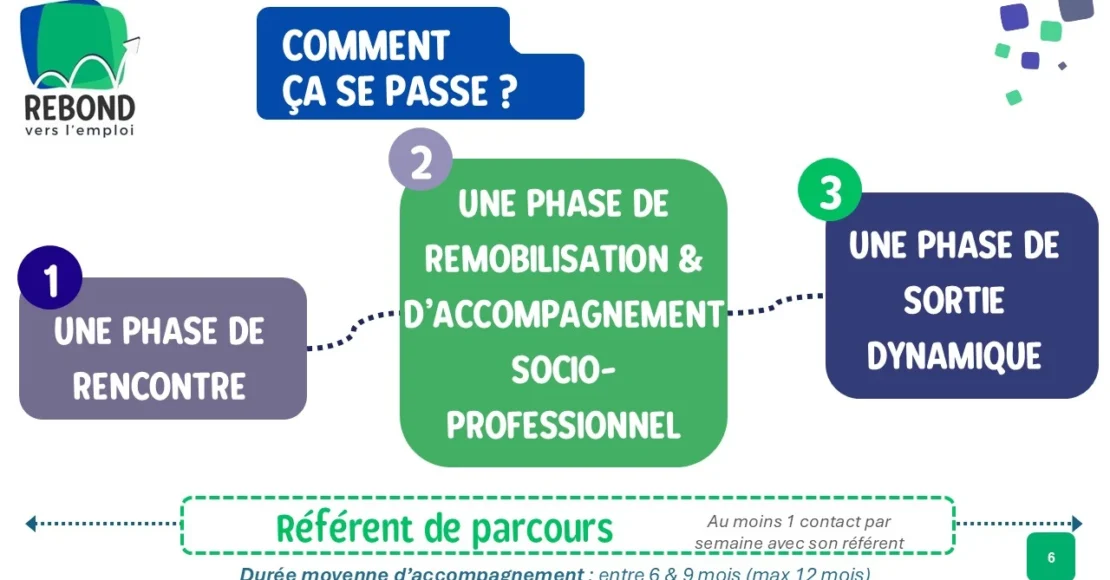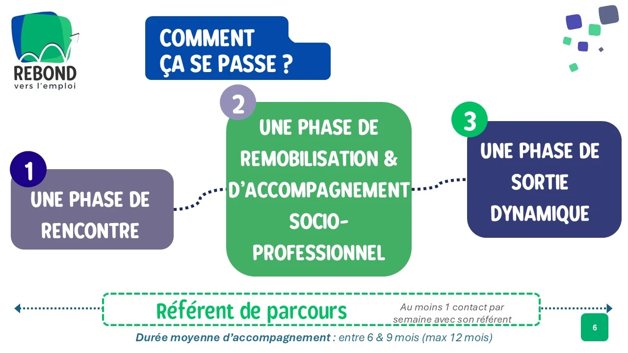 Rebond vers l’emploi est un dispositif de remobilisation et d’accompagnement social & professionnel, avec pour objectif l’accès à la formation, à l’emploi ou aux dispositifs de droit commun (France Travail, Mission Locale, Education Nationale, …).